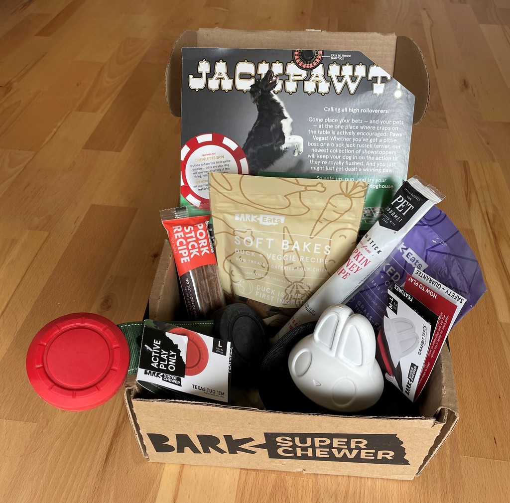 Whether it?s dug in the backyard or not, your dog?s got an ace in the hole and a box?s worth of winnings! April?s ?Jackpawt!? Super Chewer box is packed with toys, chews, and treats? just give a good throw and let them fall where they may.