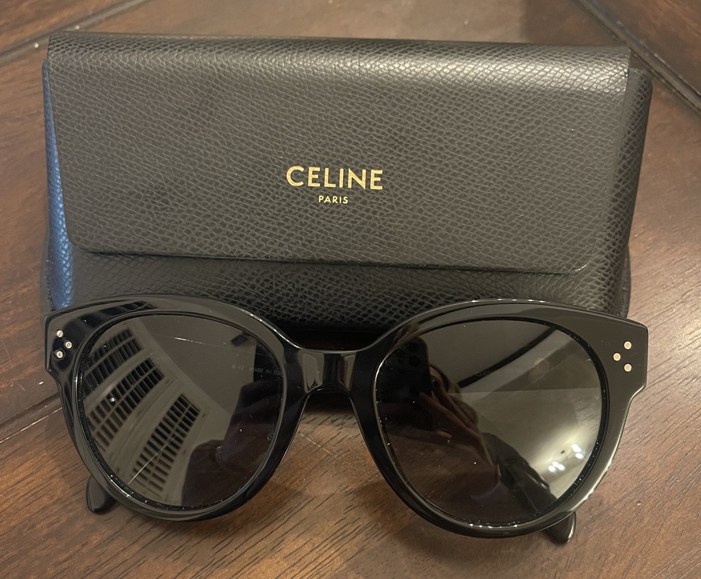 Celine sunglasses model number CL401691. Shiny black color, round rim, gray gradient lenses.
