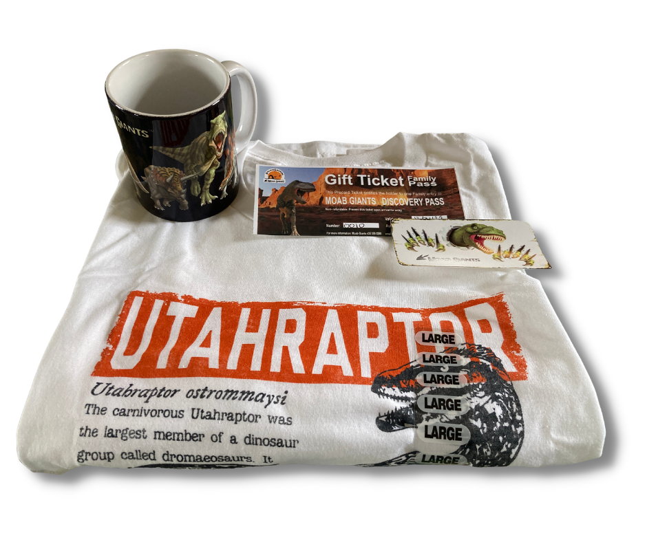 This is a great deal for all dinosaur lovers! The bundle consists of one VIP Family Pass (which includes a one day entry for your family to both the outdoor exhibits and indoor interactive museum, PLUS the 3D theater and the Prehistoric Aquatic Experience), an adult (size large) Tee-shirt, a coffee mug, and a sticker. After you visit Moab Giants, you'll bring back memories each time you use the mug or wear the shirt!