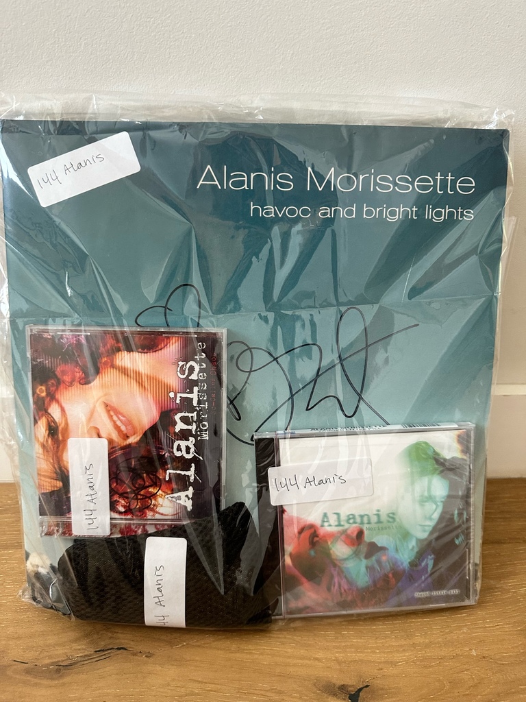 You oughta know about this incredible auction item, perfect for any Alanis Morissette fan. First off, you've got a SIGNED vinyl album of Havoc and Bright Lights! Then, you have one of her harmonicas! And top it off, you get two of her CD's: Jagged Little Pill (THE GOAT!) and So-Called Chaos.