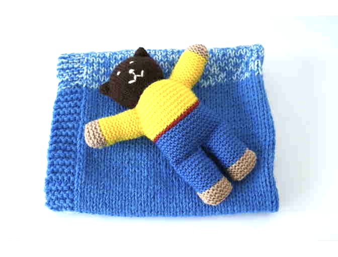 Generously donated handknit cat by Diane Nowe and blue blanket donated by Jill Raum.