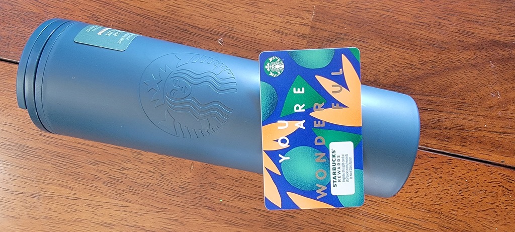 Starbucks teal to go mug for all your roadies plus a $20 gift card to Starbucks