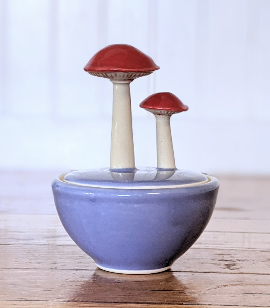 "This tiny cutie was handmade using molds made from my wheel thrown work. I then topped it off with an adorable pair of mushrooms and glazed it in bright, fun colors.