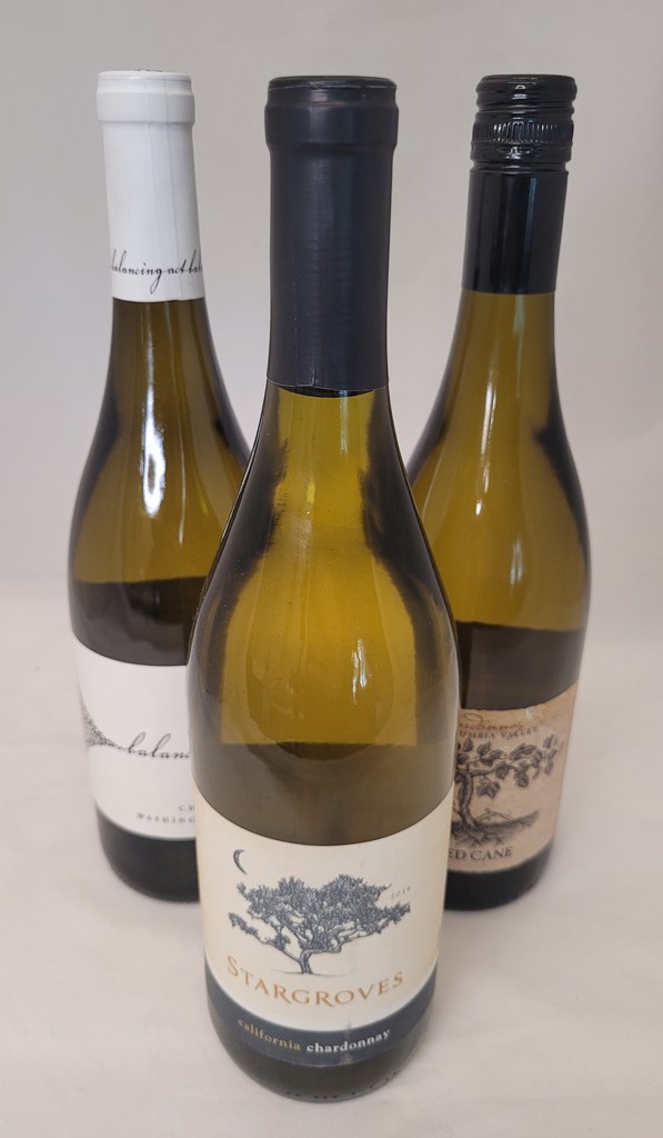 1 bottle of Buried Cane Chardonnay (Columbia Valley 2015); 1 bottle of Stargroves Chardonnay (California, 2018); 1 bottle of Balancing Act Chardonnay (Washington State, 2018)