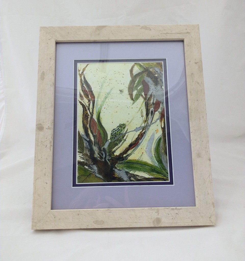 A semi-abstract watercolor using the pen & wash method in a destressed frame.