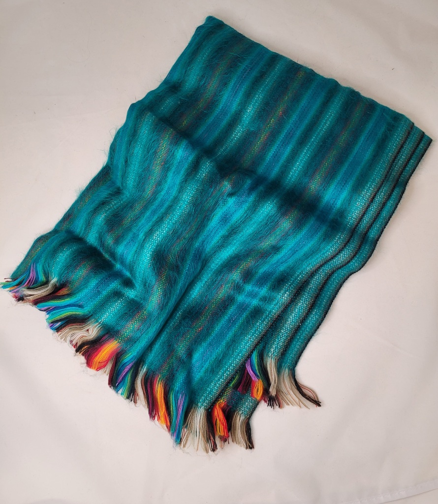 Stunning bright teal and multi colored woven shawl, made in Ecuador from Peruvian Alpaca fibers. Contains 20% acrylic.