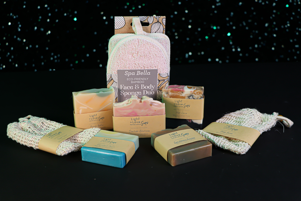 In addition to these amazing soaps, you get two soap savers and an eco-friendly bamboo face and body sponge. It's like a vacation in your bathtub!