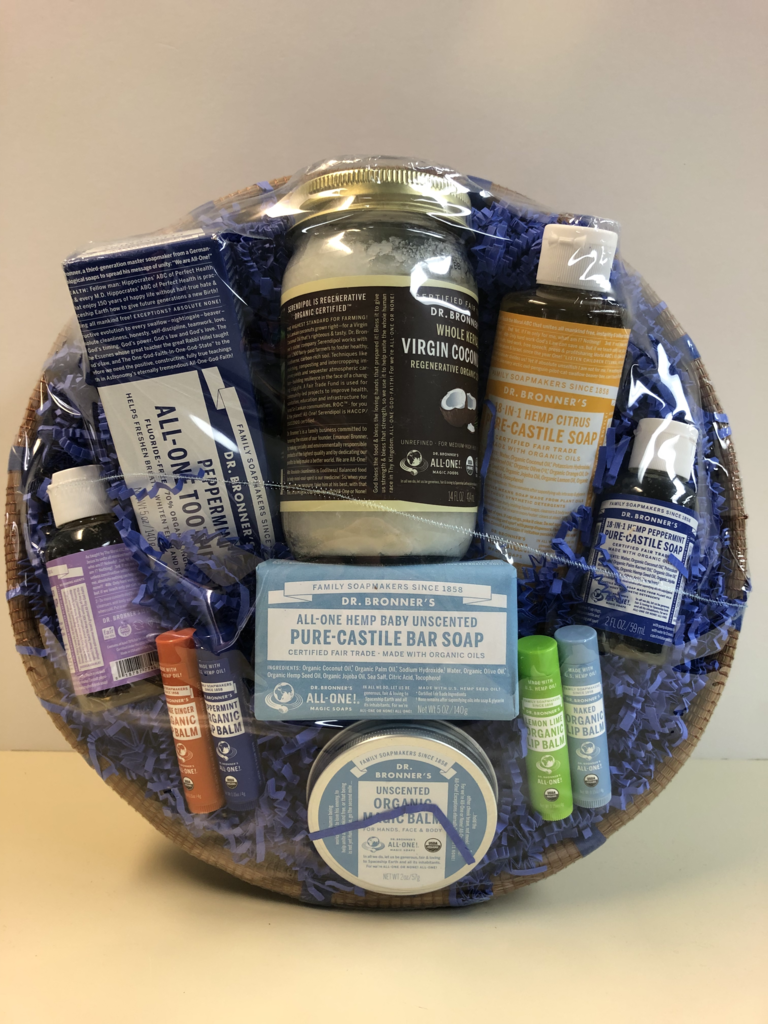 An assortment of Dr. Bronner's organic soap and personal care products.