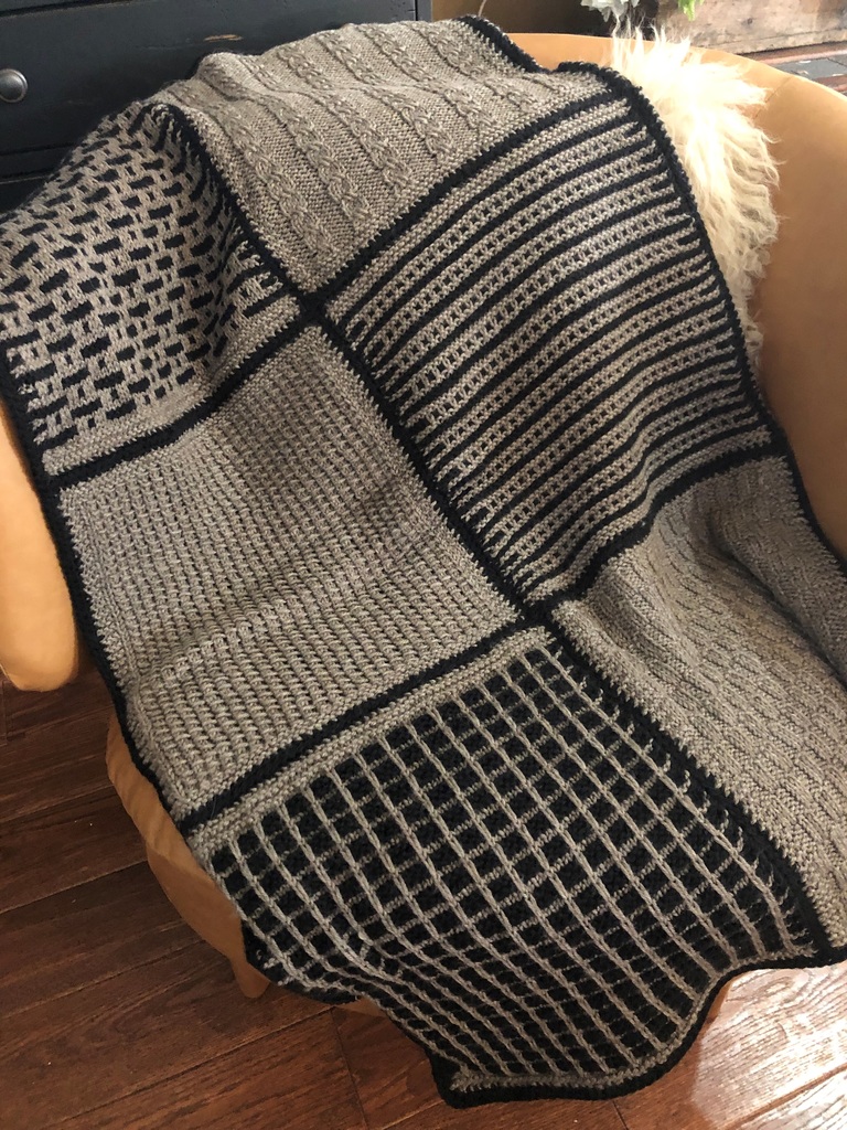 This stunning blanket was hand knitted using the square of the month technique. Each of these 12 squares was knitted in a unique and intricate pattern. Berroco's Ultra Superwash Wool yarn was used to create this one of a kind heirloom. Made with strong, versatile, high quality 4 ply worsted weight yarn, this piece is machine-washable and will last for many years to come.