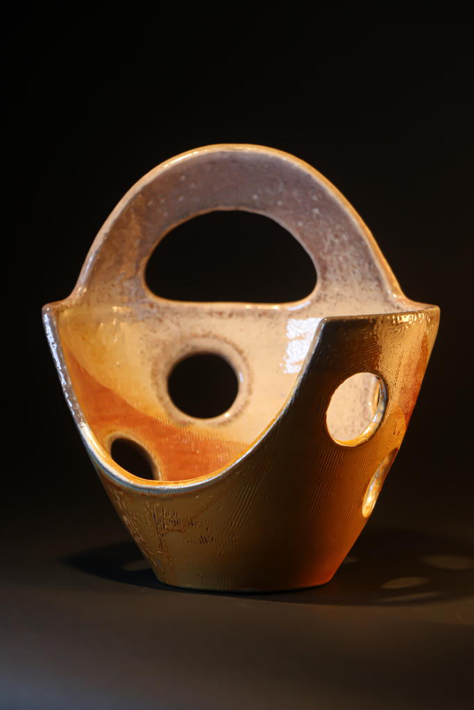 This unique piece is a reimagined basket, soda-fired in shades of orange, yellow and white.