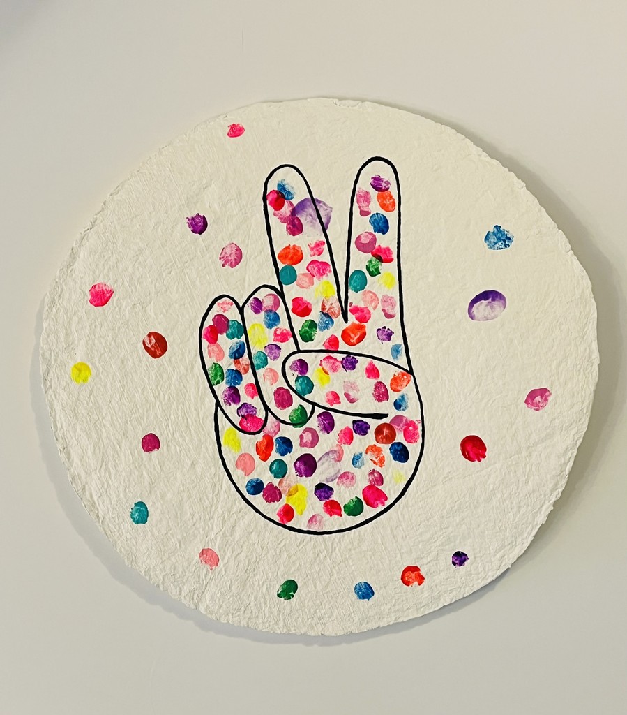 What's Pre-K all about? Learning to get along with one another and navigate relationships in the classroom! Hence the chosen motif of the peace hands. And, bonus, the MNS Pre-K students got to practice getting along as they finger painted, by making sure they didn't smudge their friends' previously painted finger dots. Artwork comes with a color chart so parents and Pre-K friends can identify whose print is whose.