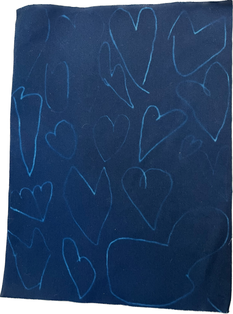 What will our kindergarteners take with them into the future? The importance of being kind to others! And what better way to show that than by making a bunch of hearts. K-304 first drew some beautiful hearts on paper, which we traced into one large collage on tracing paper. Then we laid the tracing paper over cyanotype fabric, put it into the sun and watched the magic happen!