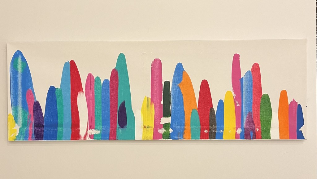 This year the 4th grade created pieces inspired by their NDI performance, "Try to be a rainbow in someone's cloud" (which was itself inspired by a Maya Angelou quote). Here, Katie and Bari's class chose paint colors and dotted them across the canvas. We then squeegeed the dots from top to bottom, creating the colorful people-in-a-crowd effect.