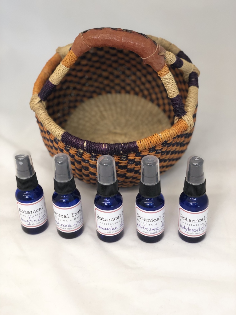 Basket includes 5 distillations: Doug Fir distillation, damask rosa water, holy basil distillation, White Sage distillation, and lavender distillation.