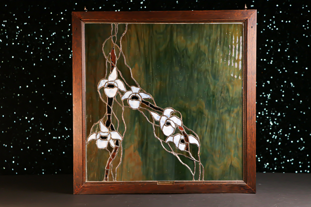 This gorgeous art glass window piece by Sourlis Glass Studio will never give you a bad view. You'll have spring year-round when you look upon beautiful white orchids in a sea of bright green and orange.