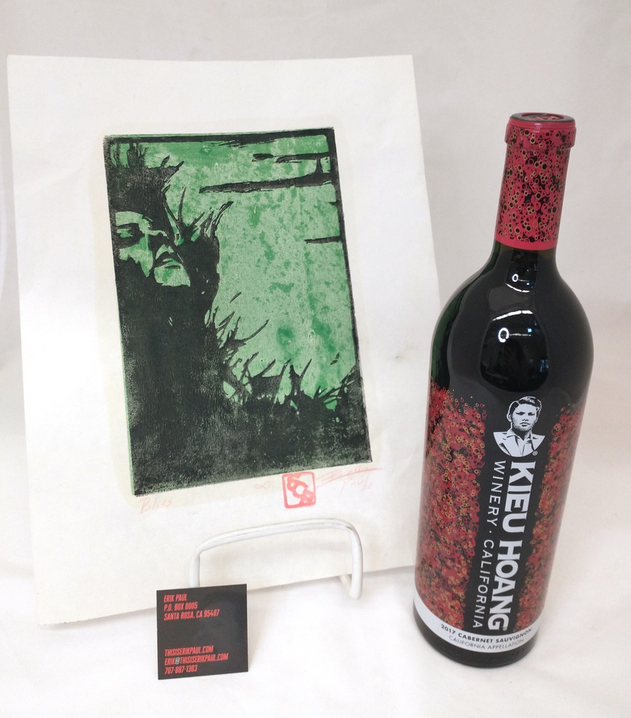 Block Print "Bliss" and wine to accompany it, 2017 Kieu Hoang Winery Cabernet Sauvignon