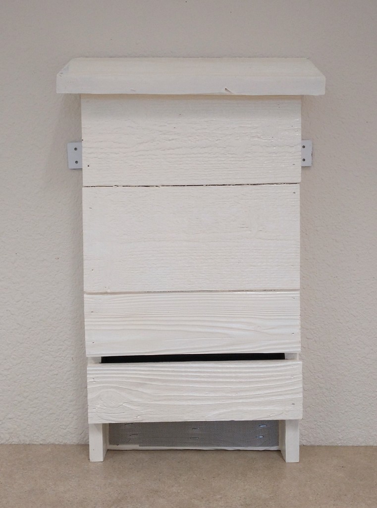 Bat House - Constructed from recycled redwood boards, this small bat house measures 12" x 24" x 3" and is painted on the outside. You can hang it from the eaves of your home and provide housing for bats in your neighborhood. Photo of installed unit shows an occupied bat house in Sebastopol installed on an east facing wall.