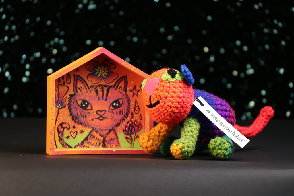 She has donated some fabulous items to our auction over the years but this one is a favorite of the Crossroads Fund staff! A super adorable and adorably colorful crochet kitty - a.k.a. Meowstrochika - and a little house-shaped art piece with a sweet cat painting inside (6.5" tall x 7" wide).