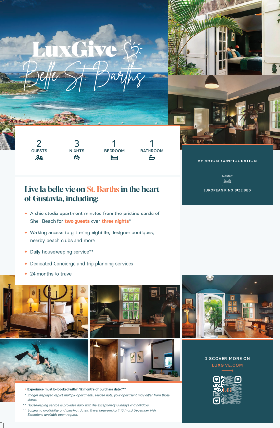 Your St. Barths experience includes 3 nights for up to 2 guests in a chic studio apartment at the heart of Gustavia.