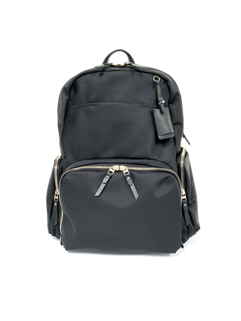 This high quality nylon lightweight backpack is the perfect carryall for everyday work and travel. The backpack features 2 main compartments and 3 zipped pockets on the outside. The back compartment is padded to fit up to a 15" laptop. The shoulder straps are super padded to sit comfortably on your shoulders. An open slot on the back of the bag allows you to pop it over your luggage for a hands-free stroll through the airport.