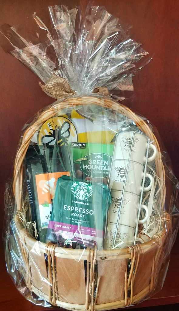 This Gift Basket has 3 separate kinds of coffee which include Starbucks Espresso Roast ground, Whole Foods 365 Pleasant Morning Buzz Vienna Roast and Green Mountain Hazelnut pods. It has 4 Espresso cups printed with Bee Brave which have their own holder. Please note the cute Bee theme running thoughout the basket.