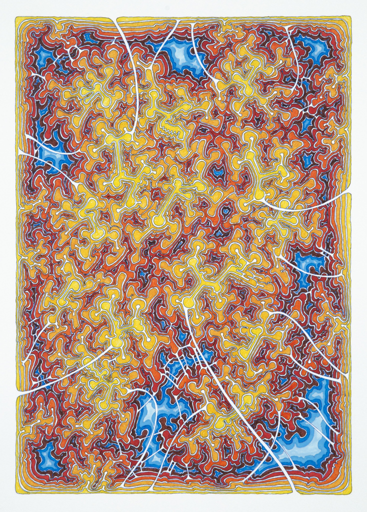 "Contained Conundrum", 2022 ink and acrylic on paper 13.5 x 11 in. Framed The drawings of Daniel Zeller have biomorphic, cartographic and psychic perspectives of planetary or cellular bodies. He draws in a meditation mode of consciousness. Daniel Zeller drawings have similarities to many things: a satellite view of a distant country, a microscopic vision of an organic mass or a briefly retained image after a recent dream. His compositions twist and vibrate, persuading the viewer to come closer and closer. What seems two-dimensional translations of a three-dimensional world is a constant game between -formal or natural- abstraction and representation. His technique requires a meticulous and obsessive repetition as well as a series of spontaneous decisions governed by self-imposed rules and conditions. This tension (or perhaps contradiction) between spontaneity and predictability is central in his creative process. Zeller 's work is represented in the permanent collections of the MoMA - Museum of Modern Art (New York), Whitney Museum of American Art (New York), Albright -Knox Art Gallery (Buffalo, NY), Los Angeles County Museum of Art (LA, CA), among others.