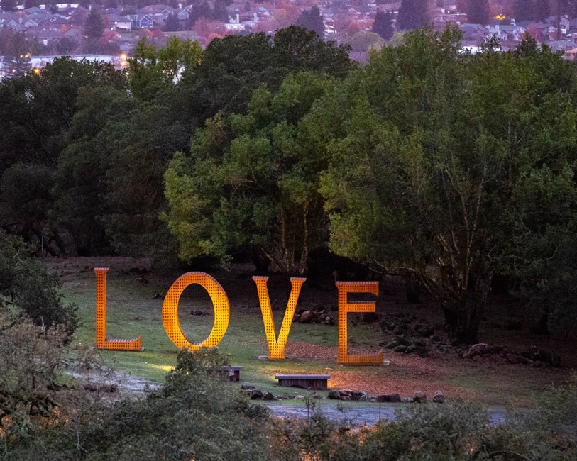 In addition to rotating art shows, Paradise Ridge Winery is also home to permanent exhibits, including the iconic LOVE sculpture. This 12-foot-tall piece is part of Laura Kimpton's "Monumental Words" series, which debuted at Burning Man in 2009. LOVE is famous for standing tall during the 2017 firestorms that destroyed everything around it.