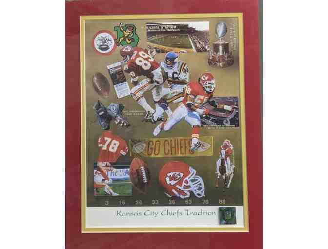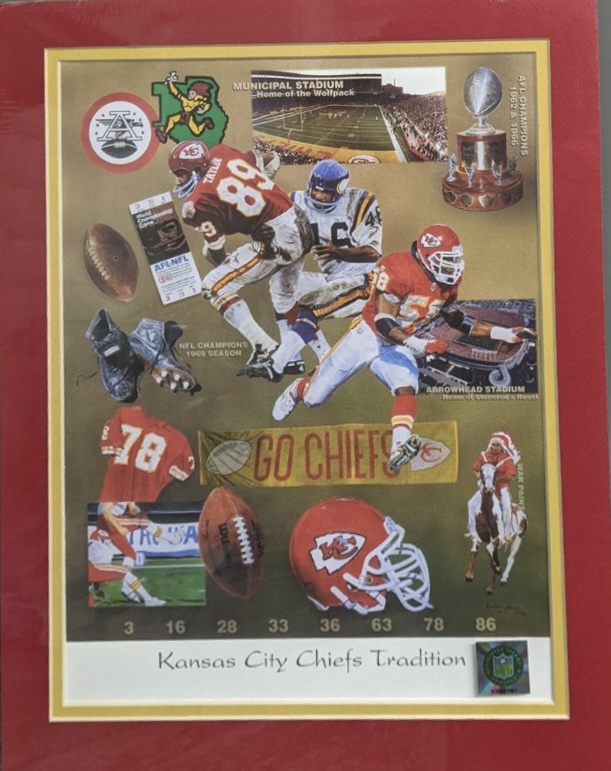 Framed and matter artwork by artists Christopher Paluso referencing Chiefs Superbowl 4 win.