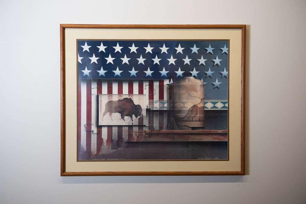 The artwork has a contemplative quality, with the bison's solitary figure adding a sense of solemnity or reflection. This could suggest themes of nature, history, and national identity.