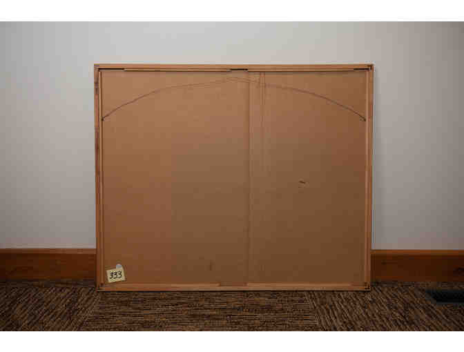 The piece is framed with a double mat, which adds depth and draws the viewer's eye inward toward the central elements. The outer frame is a simple, classic wooden design that complements the traditional and historical themes represented within the artwork. Overall, the piece could be interpreted as a tribute to the American spirit, nature, and heritage.