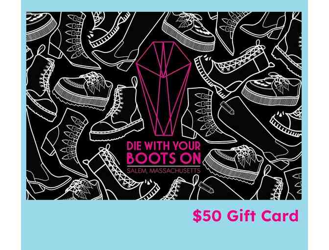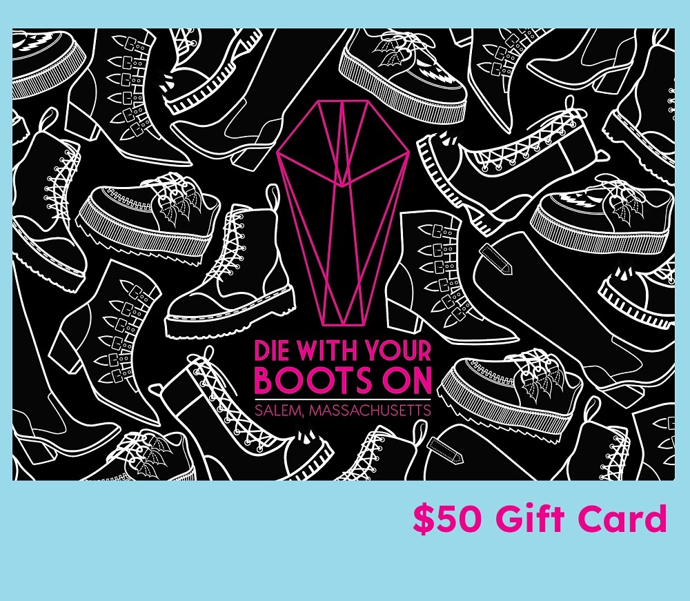 Die With Your Boots On was established in 2018 and is a small family-owned business specializing in weird fashion for weird people!. Nick and Amber, the owners, along with a handful of dedicated weirdos, do everything from photography, social media, and graphic design, to running their Salem shop, to answering customer service emails, to modeling the clothes, to packing up and shipping your order.