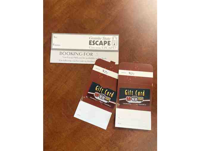 Included are a certificate for Granite State Escape for three in Manchester NH and two $25.00 gift cards to CJ's or T-Bones.