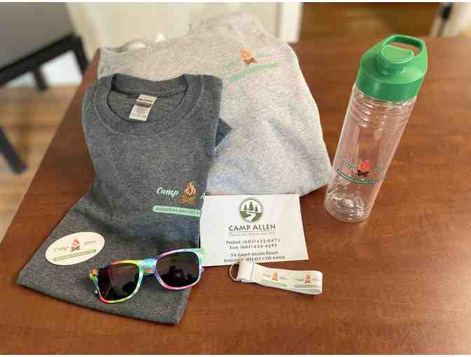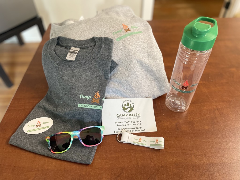 Included in the goodie basket are a sweatshirt, t-shirt, water bottle, and some small Camp Allen memorabilia.