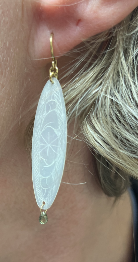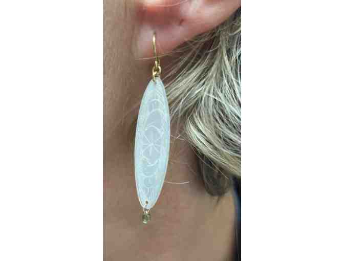 This auction is for a pair of handmade 18 karat earrings made with antique mother of pearl Chinese gaming tokens and green sapphire briolettes - they are stunning!