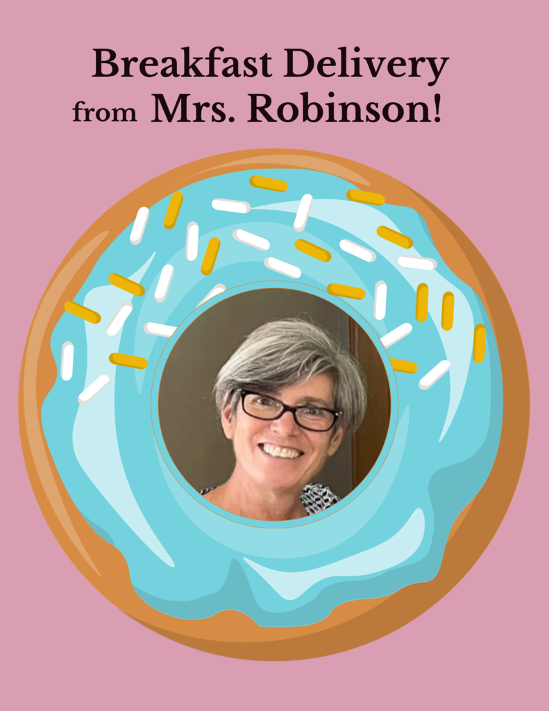 One morning before school, during the 2023-2024 school year, the fantastic Mrs. Robinson will deliver a dozen store-bought donuts and orange juice to your home!