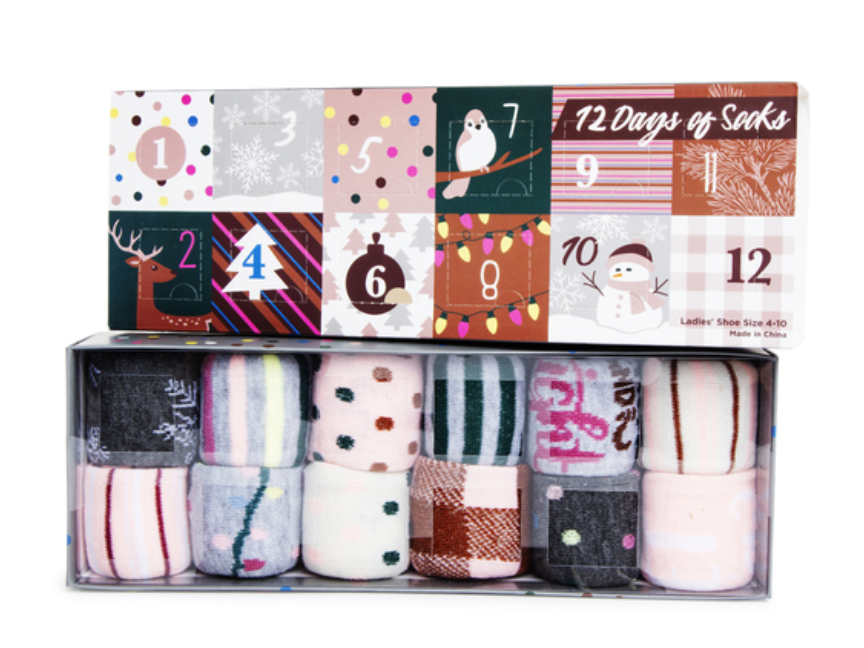 12 days of christmas box includes no-show socks for ladies in all sorts of pretty colors and patterns. holiday-themed and perfect for chilly weather.