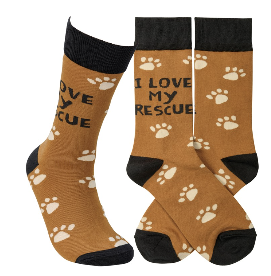 These colorful socks feature woven designs with coordinating "I Love My Rescue" sentiment. Cotton, nylon, spandex. One size fits most.