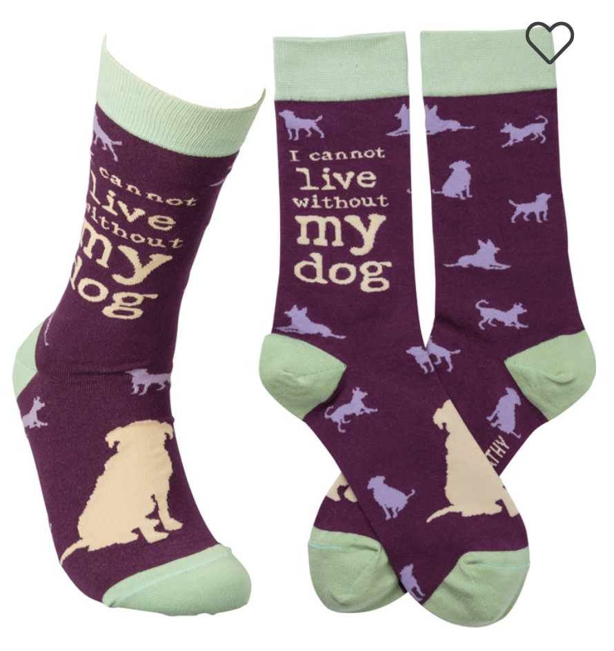 These colorful socks feature woven designs with coordinating "I Cannot Live Without My Dog" sentiment. Cotton, nylon, spandex. One size fits most.
