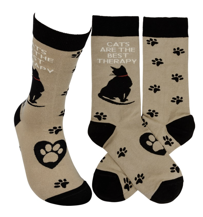 These colorful socks feature woven designs with coordinating Cats Are The Best Therapy sentiment. Cotton, nylon, spandex. One size fits most.