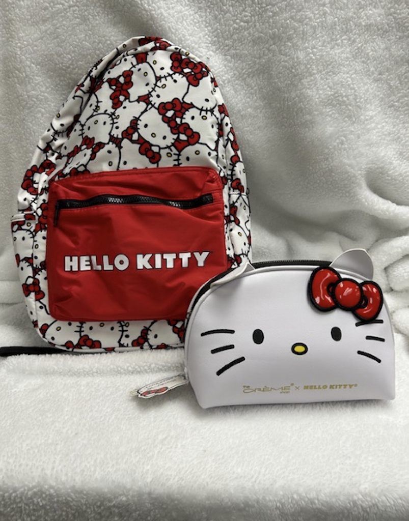 With this backpack and accessories/makeup bag you can strut your stuff in style with this famous kitty!