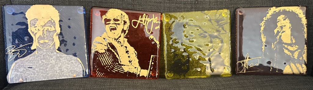 Celebrate the icons of music history with this stunning set of four handcrafted glass coasters from Verre Modern.