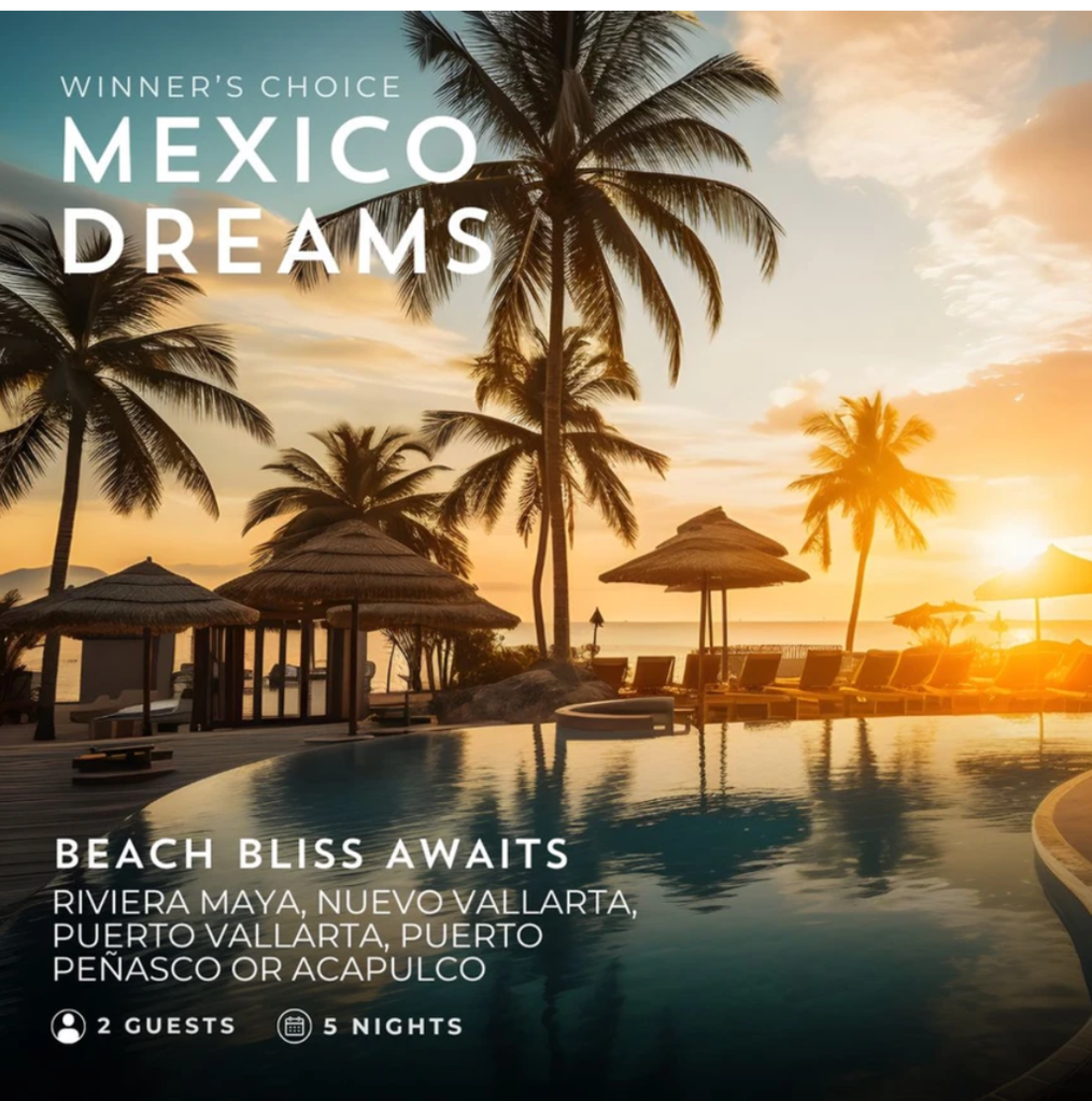 Package Winner will receive a unique access code to book their stay directly with the reservation team in Mexico. Reservations must be booked 60 days before travel, and property inventory is subject to availability. The Unique access code must be activated within 12 months, and travel must be booked and completed within 18 months of receiving your code. Only one package can be sold per household. Once confirmed, all reservations are final. Packages may not be transferred or resold.