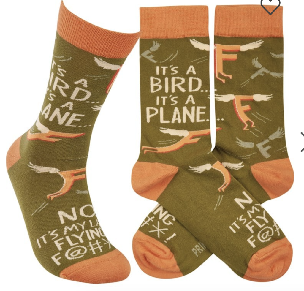 A pair of colorful woven socks from our LOL Made You Smile Collection displaying hand illustrated designs of the letter F with wings and a sentiment that reads "It's A Bird... It's A Plane... No... It's My Last Flying F@#*!" Socks feature a one size fits most design made with cotton, nylon, and spandex.