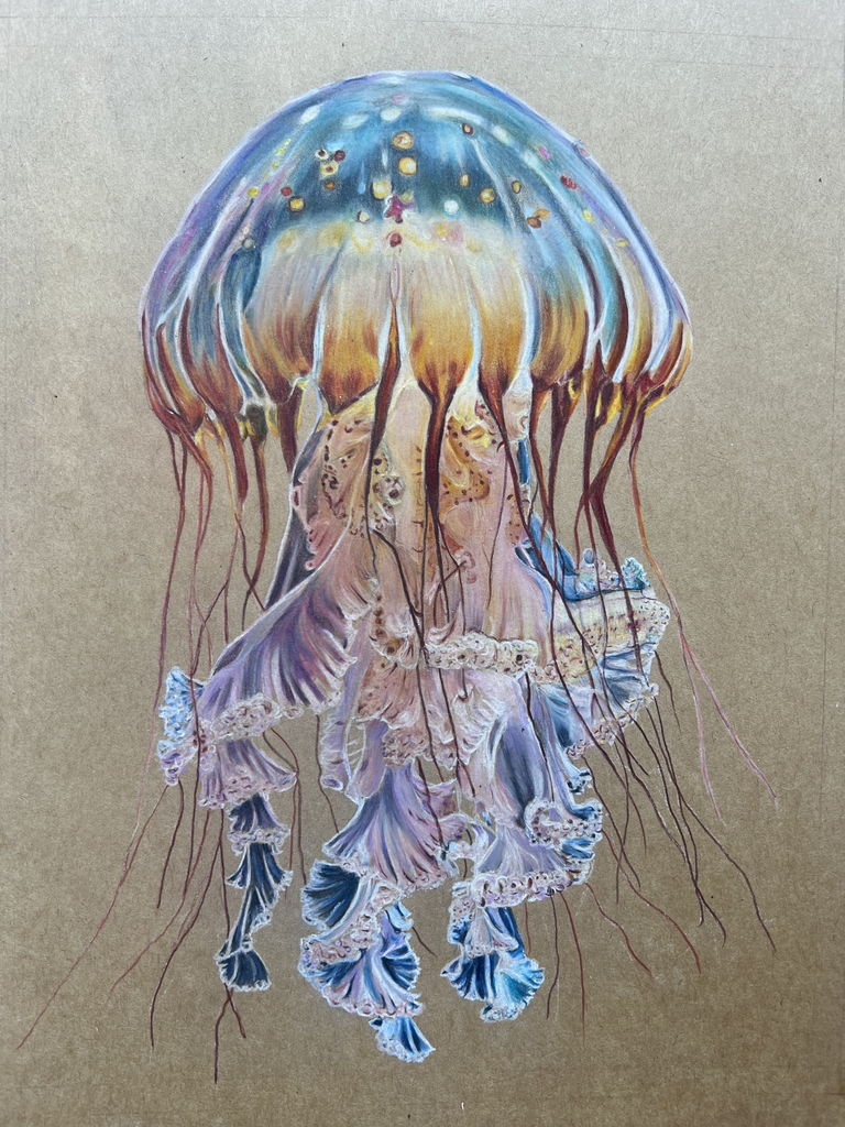Dive into the depths of the ocean with this captivating original drawing of a jellyfish, brought to life with high quality, fade resistant colored pencil over the course of 25 meticulous hours. This piece blends vivid color, flowing lines, and delicate detail to capture the quiet elegance of one of the sea's most mysterious creatures. Created and donated by a local parent artist, this one-of-a-kind work is framed and ready to display. Its perfect for anyone who appreciates marine life, intricate artwork, and supporting our incredible school community, making this a meaningful and beautiful addition to your home or office.