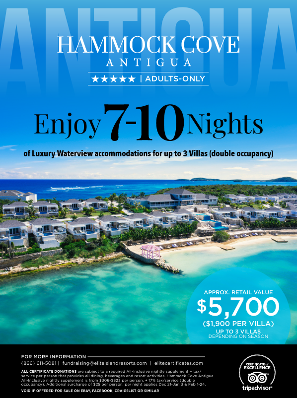 ALL CERTIFICATE DONATIONS are subject to a required All-Inclusive nightly supplement + tax/ service per person that provides all dining, beverages and resort activities. Hammock Cove Antigua All-Inclusive nightly supplement is from $306-$323 per person, + 17% tax/service (double occupancy). Additional surcharge of $25 per person, per night applies Dec 21-Jan 3 & Feb 1-24.