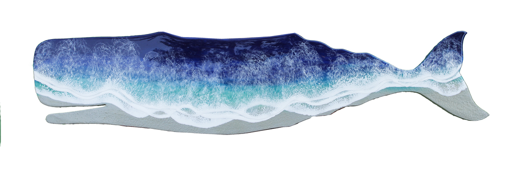 Ej.Artistry's latest creation?a mesmerizing piece of resin wave art delicately crafted upon the graceful silhouette of a whale. On one side, the night ocean unfolds in all its mysterious splendor, with waves crashing against a starlit sky, imbued with a tantalizing texture that invites touch. On the flip side, inspired by the serene beauty of Cape Cod, a vibrant daytime ocean scene emerges, where blue green waters dance under the warm embrace of the sun. Each layer of resin whispers tales of two contrasting worlds, inviting viewers to immerse themselves in the enchanting duality of nature's endless allure.