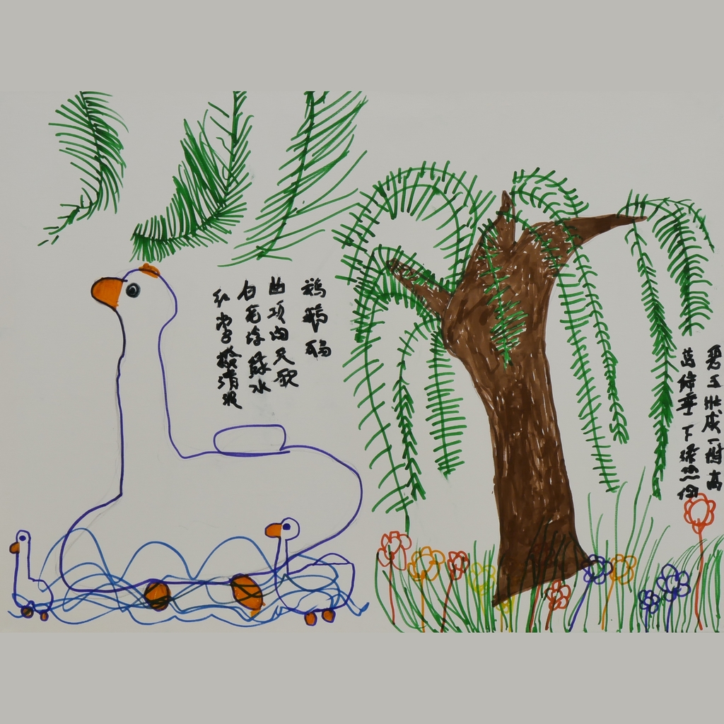 This enchanting piece, lovingly created by young children, captures the innocence and imagination of early childhood. With bold lines and bright colors, the drawing depicts a graceful goose resting near the water with its goslings, framed by a willow tree that stretches outward in vibrant green. Simple yet profound, the artwork radiates a sense of peace, family, and belonging.