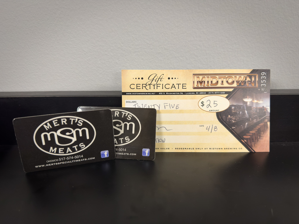 Two $25 Gift Cards to Mert?s Specialty Meats ? Pick up top-quality meats, house-made sausages, fresh deli items, and gourmet groceries from this trusted local butcher and market. One $25 Gift Card to Midtown Brewing Company ? Head downtown for craft brews and elevated pub fare in a cozy, locally loved brewpub setting.