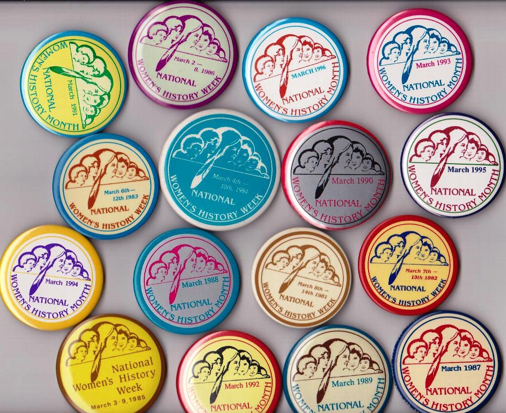 The buttons from 1981 to 1986 are for National Women's History Week and the buttons for 1987 to 1996 are for National Women's History Month.