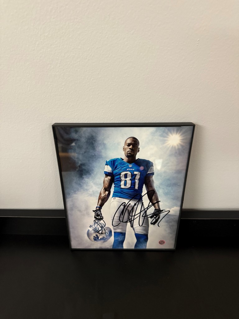 Celebrate the legacy of one of the NFL?s most dominant wide receivers with this authentic signed photo of Calvin "Megatron" Johnson. Known for his unmatched athleticism, record-breaking performances, and iconic career with the Detroit Lions, this autographed piece is a must-have for any football fan or sports memorabilia collector. A powerful tribute to a true Hall of Famer, this photo captures the intensity and excellence of a gridiron legend.